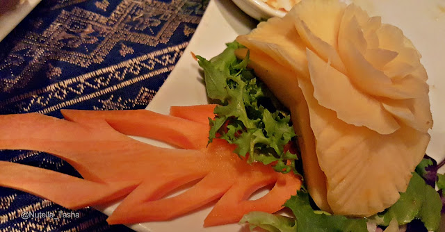 For the starters, we were presented with a mixed platter that had Scollops, Chicken Satay, Lamb Chops and Sesame Crisp Thai Crab Cakes. Although the chicken is halal, I only had eyes for the Scollops and Sesame Crisp Thai Crab Cakes. As you can see from the image above, the Scallops, that were presented with a garlic and pepper sauce, were presented beautifully. They tasted even better, as they were soft, tasty and tangy with the sauce. The crab cakes were just as good, if not amazing, and I loved the light batter that worked really well with the crab. To be honest, you couldn't really tell it was crab, so if you don't like your fish too fishy then this is perfectly. I loved the presentation of the dishes, especially the roses and leaves, shown in the image below.